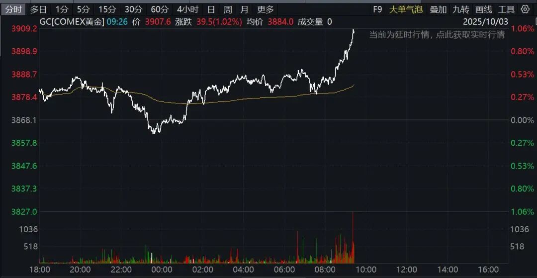 國際金價拉升,COMEX黃金期貨漲幅擴大至超1%,站上3900美元/盎司。
